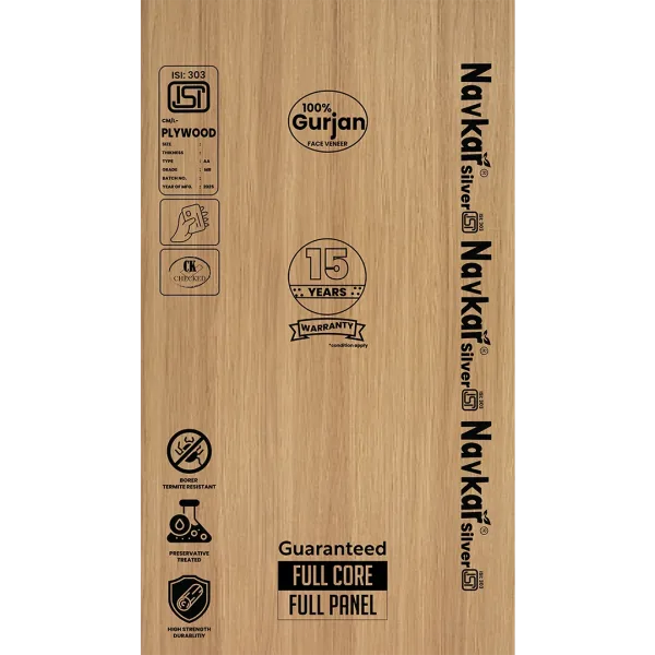 Navkar Silver BWR-303 Grade Plywood is a boiling water-resistant plywood designed to withstand constant exposure to moisture, making it waterproof and suitable for demanding applications. Manufactured to IS:303 exterior grade standards, it offers reliable weather resistance and durability for both indoor and outdoor use. This plywood is ideal for outdoor furniture such as patio chairs, garden tables, and restaurant or café furniture, and is also recommended for kitchen cabinets and other furniture where frequent contact with water or humidity is expected.